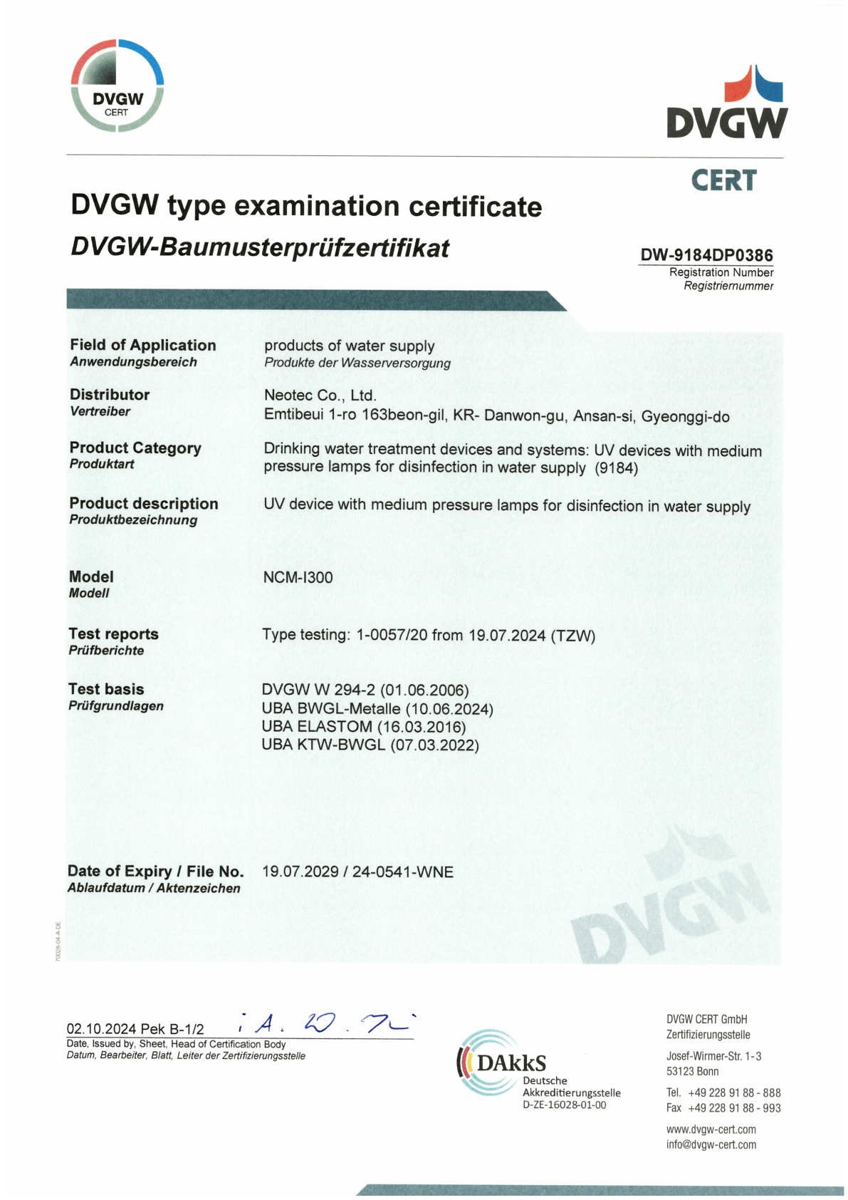 네오텍은 UV 살균 장비의 재이용수 및 식수 처리 성능에 대해 독일 DVGW와 미국 환경보호청(USEPA) UVDGM의 엄격한 국제 인증을 획득하였으며, 추가로 NSF 위생 안전 인증 및 ISO 품질/환경 경영 시스템 인증을 다수 보유하고 있습니다.